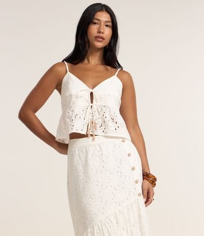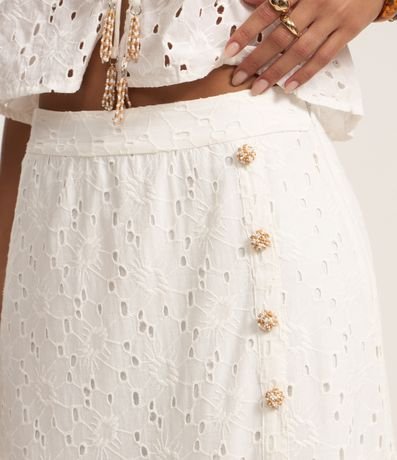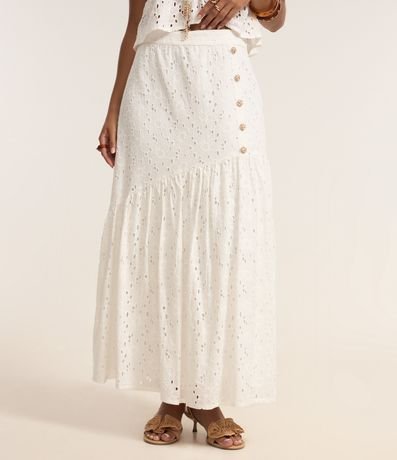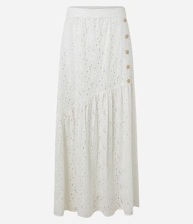 Saia feminina long midi, cós fixo, detalhe de botões contrastantes laterais, pala e textura floral. Peça confeccionada em laise de algodão certificado bci.