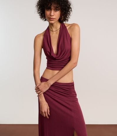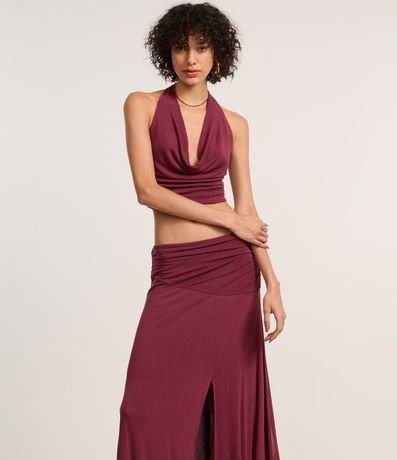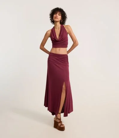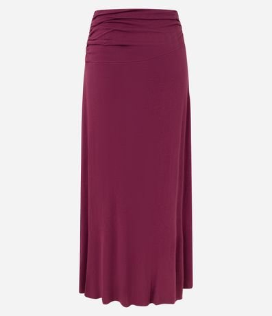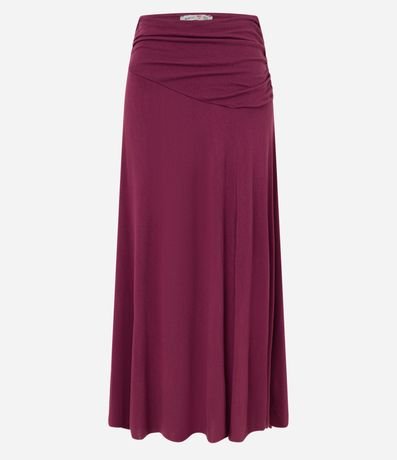 Ref: Saia long midi confeccionada em tricô leve com viscose certificada mais sustentável, cós deslocado com franzido e sem estampa.