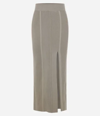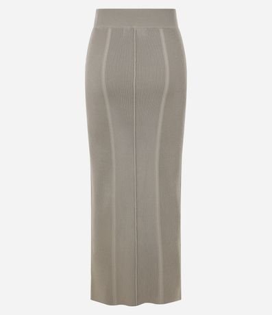 Saia feminina ajustada, de comprimento long midi, com cós elástico e sem estampa. Possui textura canelada, costuras aparentes e fenda frontal.