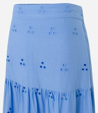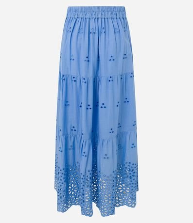 Ref: Saia feminina confeccionada em laise de algodão certificado bci, peça no modelo long midi com cós elástico, furinhos e babados.