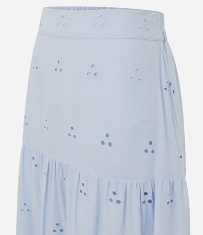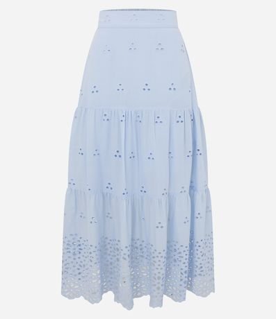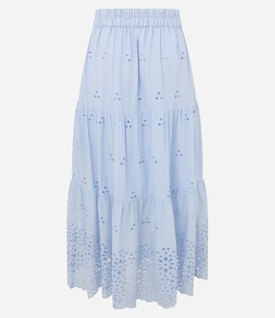 Ref: Saia feminina confeccionada em laise de algodão certificado bci, peça no modelo long midi com cós elástico, furinhos e babados.
