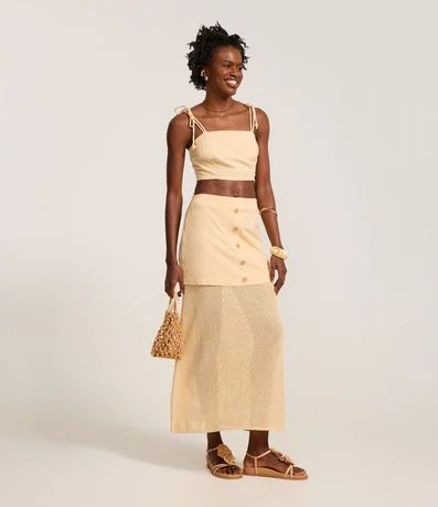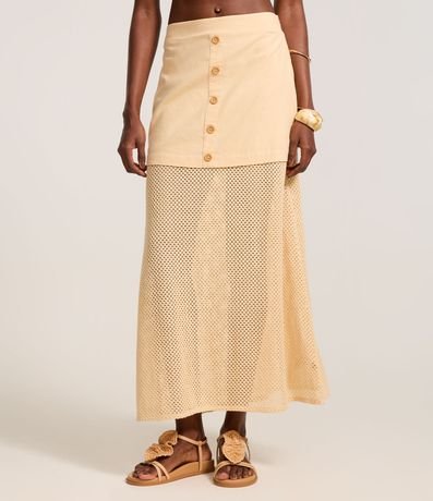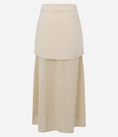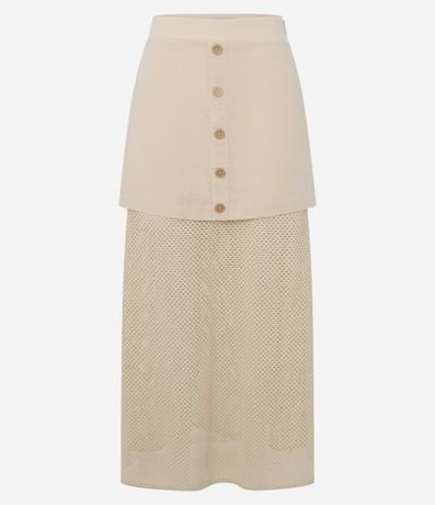 Ref: Saia long midi, reta com botões frontais, confeccionada com algodão bci mais sustentável e detalhe em tela interna.