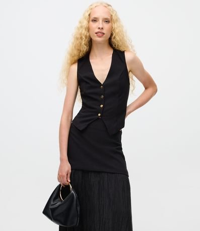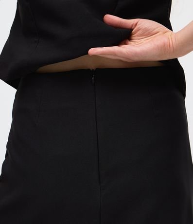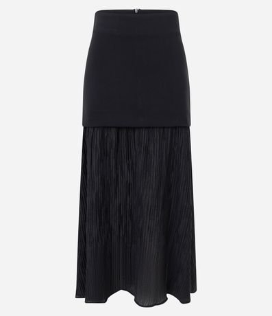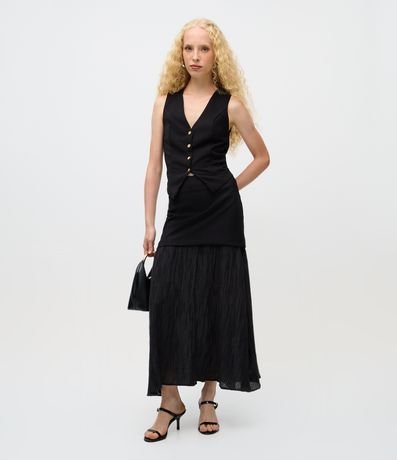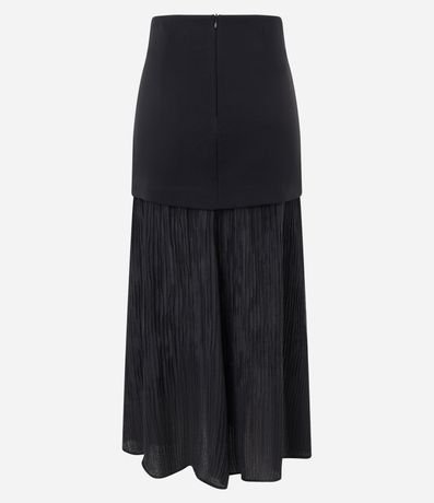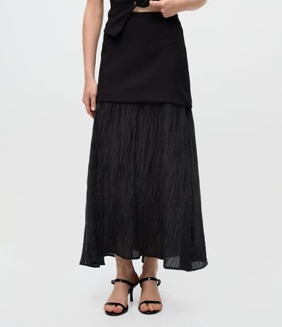 Ref: Saia feminina longa confeccionada em alfaiataria, com sobreposição que combina parte superior lisa e base longa em tecido texturizado. Ideal para compor looks modernos com movimento e sofisticação.