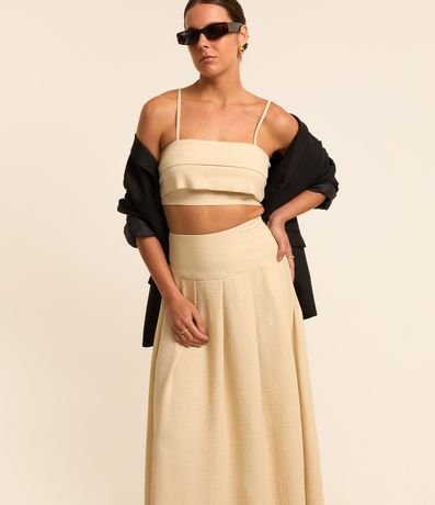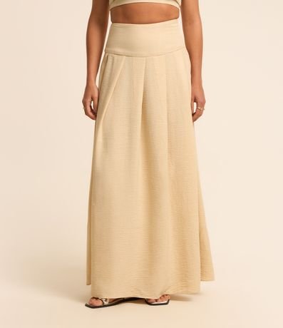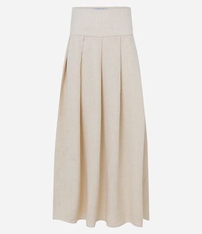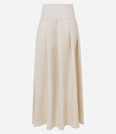 Ref: Saia alongada confeccionada em tecido com efeito e toque de linho com cós largo, fechamento lateral por zíper e pregas.
