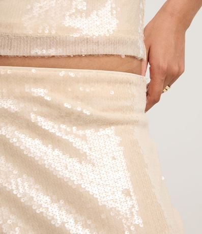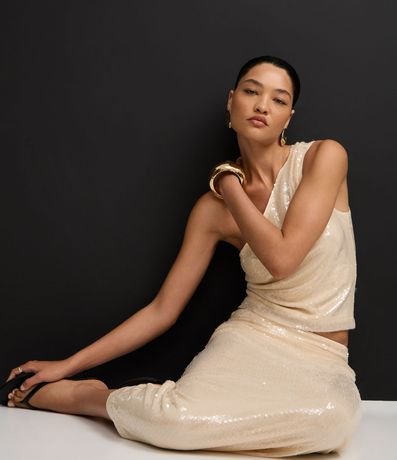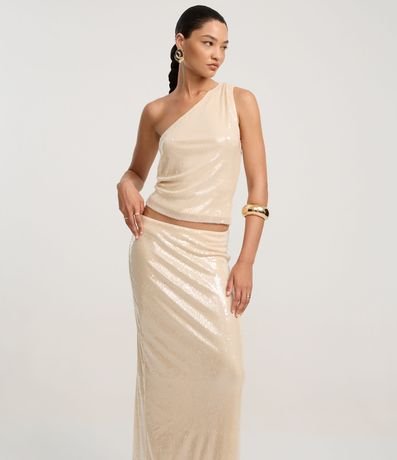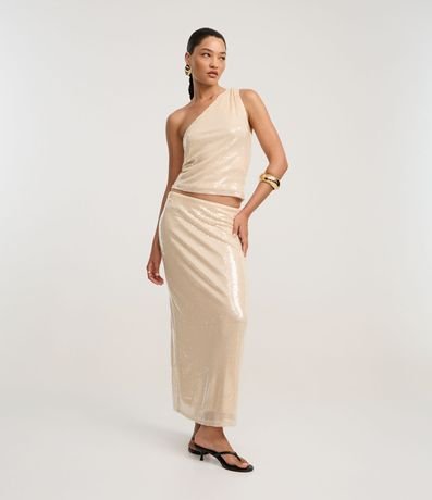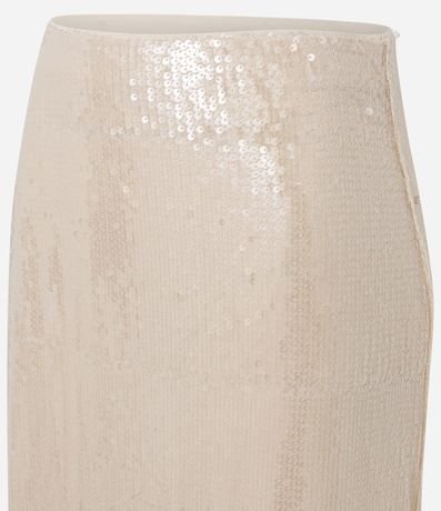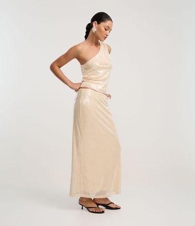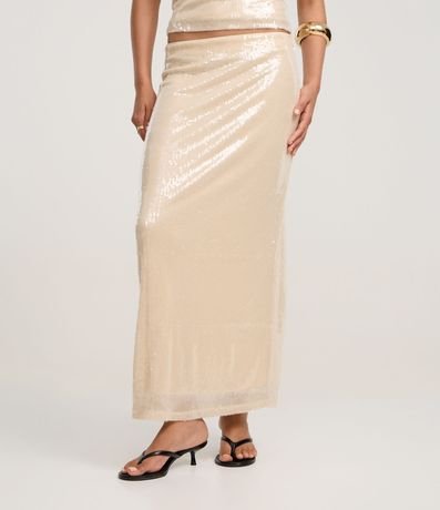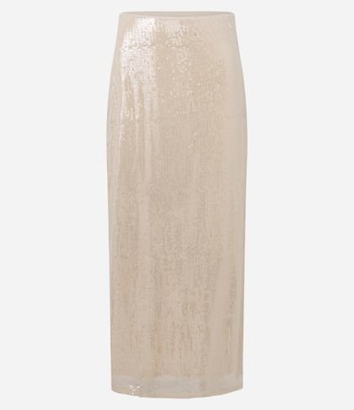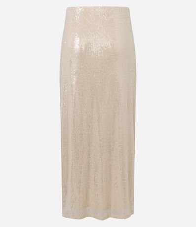 Saia reta longa, confeccionada em malha de ponto vazado, com paetês transparentes aplicados. Peça com forro e elastano.