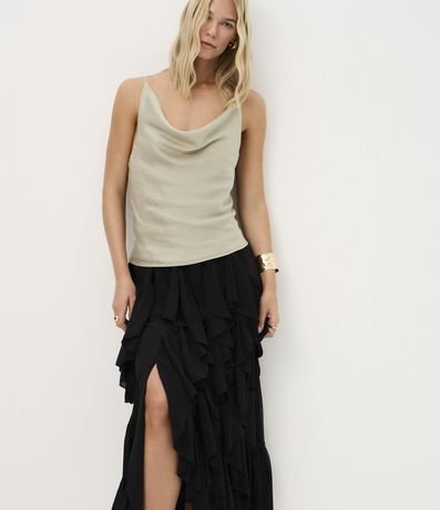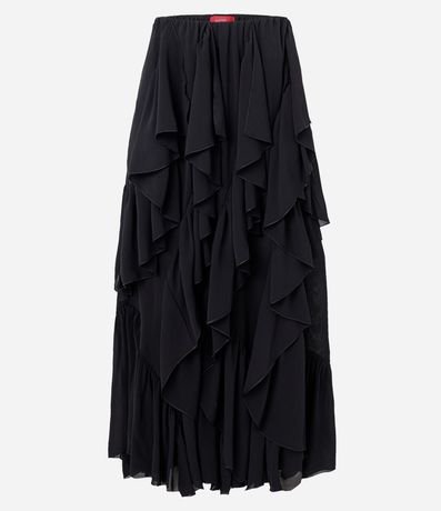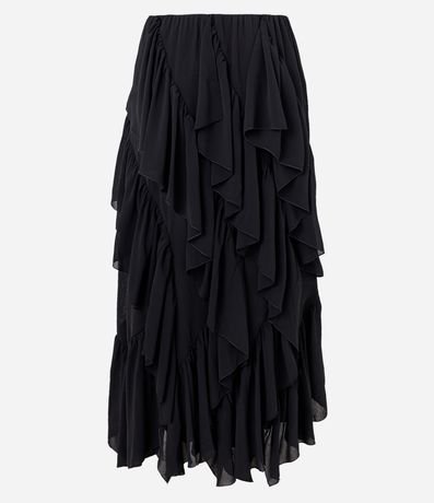Ref: Saia longa feminina confeccionada em chiffon, peça com cós elástico e sobreposições em babados assimétricos, além de uma fenda frontal que promove movimento e diversidade para seu fit.