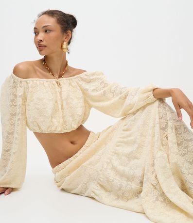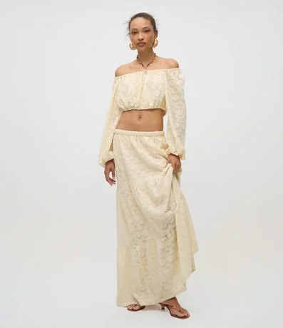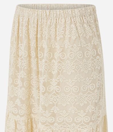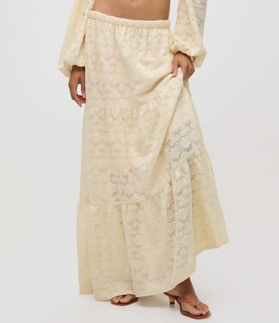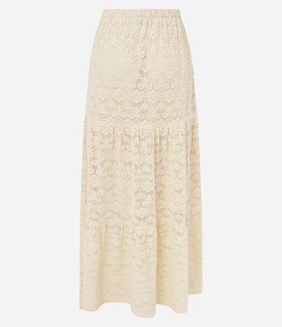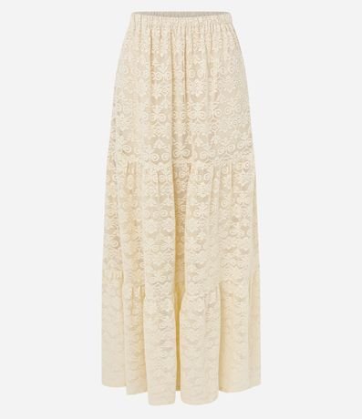 Ref: Saia feminina de modelo longo, confeccionada em jacquard de textura floral, com cós elástico e babados Marias.