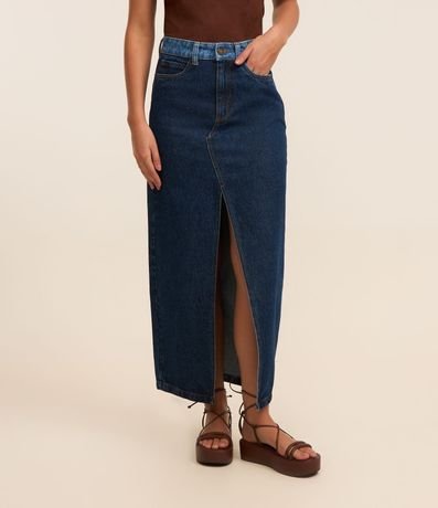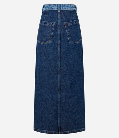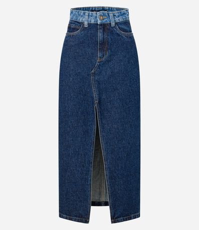 Ref: Saia reta, longa confeccionada em jeans com algodão bci, passantes no cós contrastante, bolsos e fenda frontal.