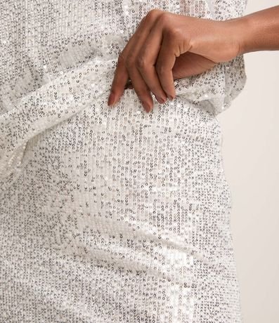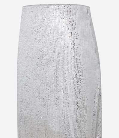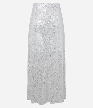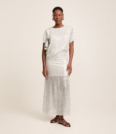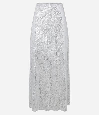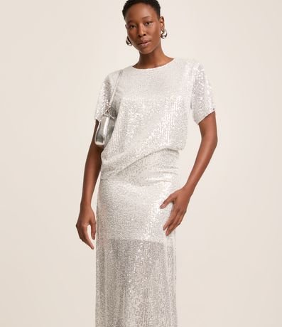 Ref: Saia feminina de modelo longo, confeccionada em malha de paetês, com forro curto e fechamento com zíper na lateral.