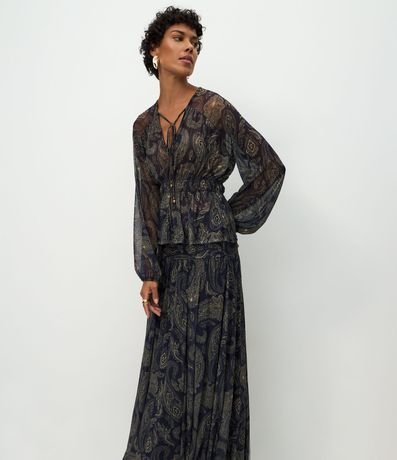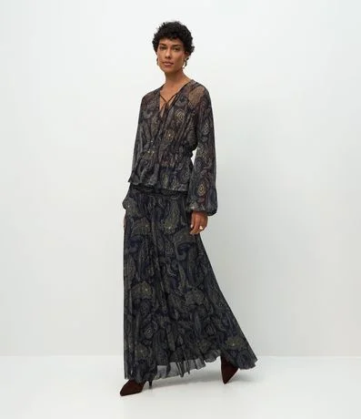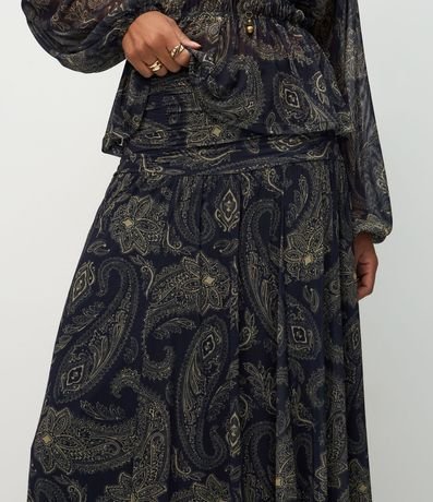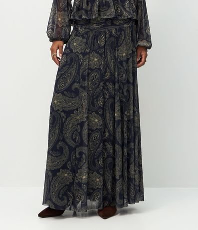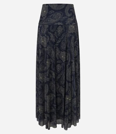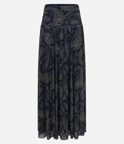 Saia Longa em Tule com Cós Drapeado e Estampa Arabesco