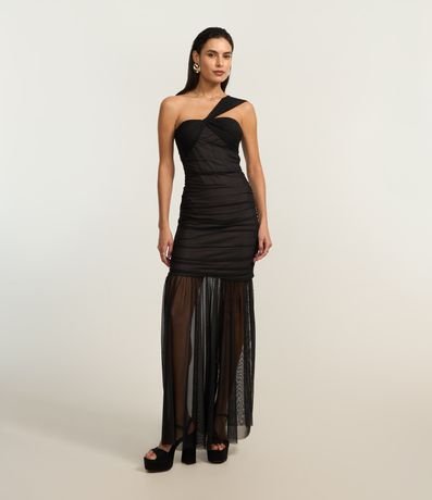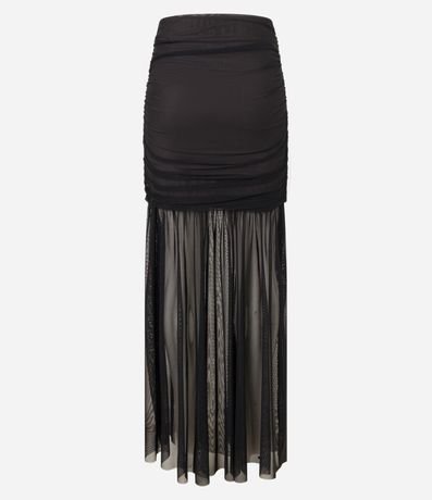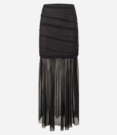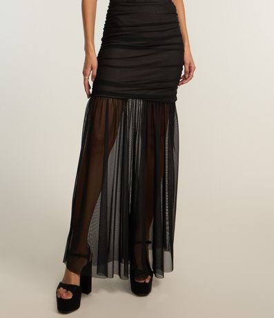 Saia longa confeccionad em tule com transparência, caldeirão com franzidos e forro curto.