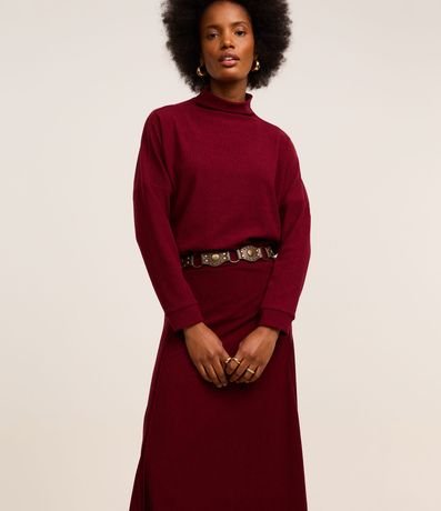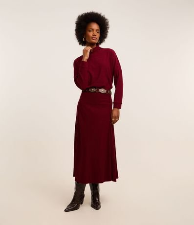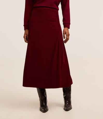Saia longa feminina, confeccionada em veludo, com cós elástico e fenda (nesga)na parte lateral da perna.
