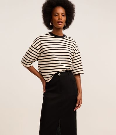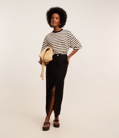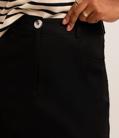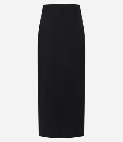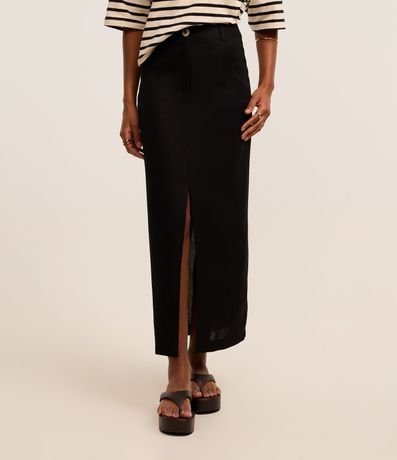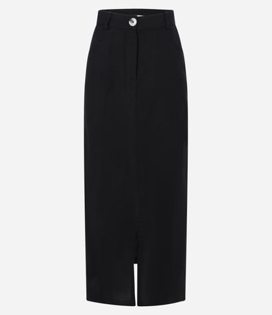 Ref: Saia reta alongada confeccionada em viscolinho com passantes na cintura, fechamento tradicional, bolsos e fenda central na região da frente.