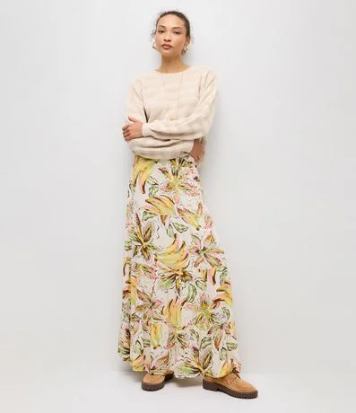 Ref: Saia longa em viscose com estampa tropical vibrante e recortes em marias que garantem movimento leve ao caminhar. Possui caimento fluido e cintura confortável, ideal para produções frescas da temporada. Confeccionada com viscose certificada e alinhada a boas práticas ambientais.