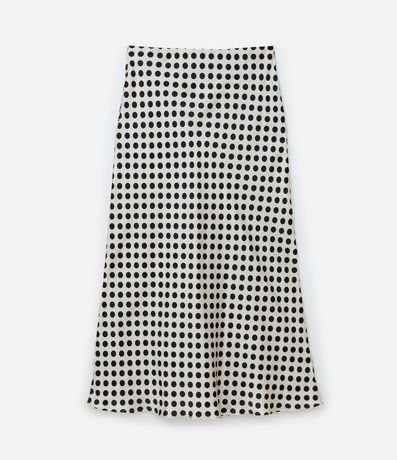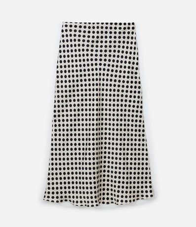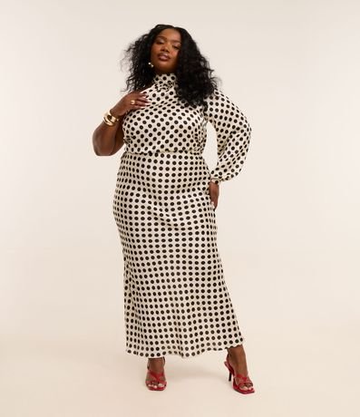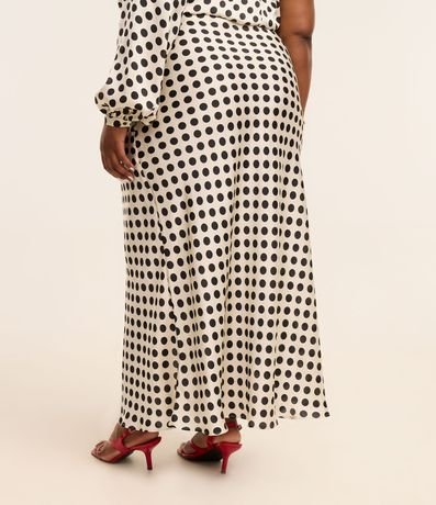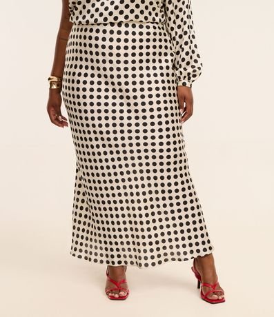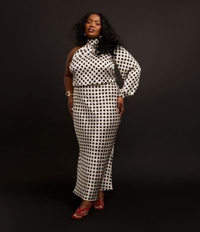 Saia feminina Curve & Plus Size confeccionada em crepe com boas práticas ambientais, acetinada com estampa poá. Peça em colaboração com a modelo Rita Carreira.