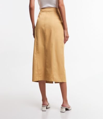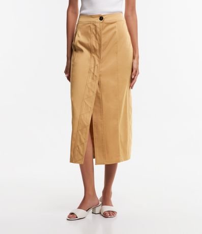 Saia midi alfaiatada feminina, com fechamento frontal, recortes e superfície sem estampa.