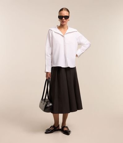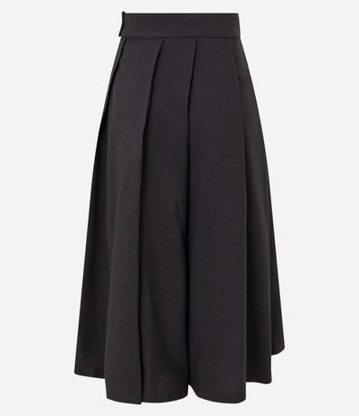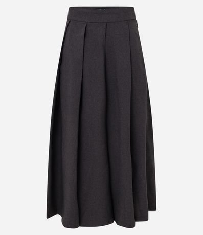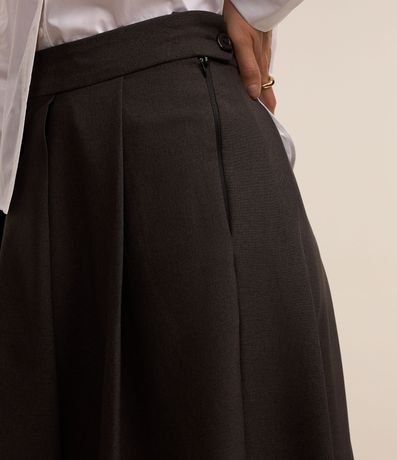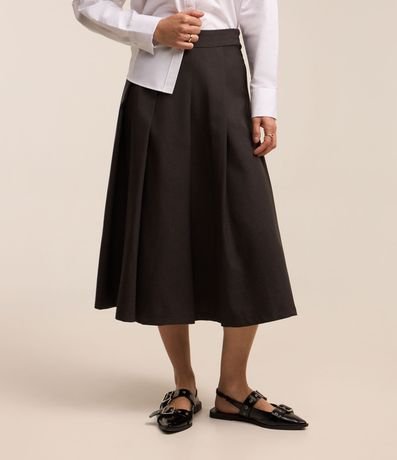 Ref: Saia evasê midi alfaiatada feminina, com fechamento em zíper na lateral do cós e pregas.