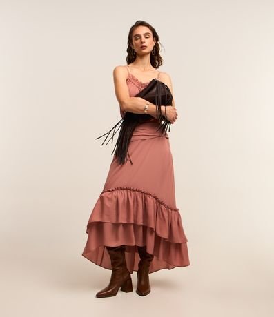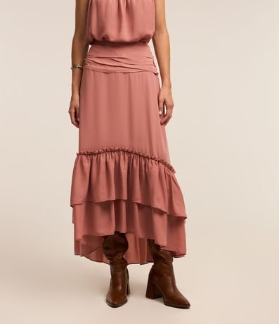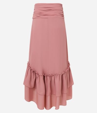 Ref: Saia midi, em alfaiataria, cós largo com detalhe franzido, barra mullet com babado e sem estampa.