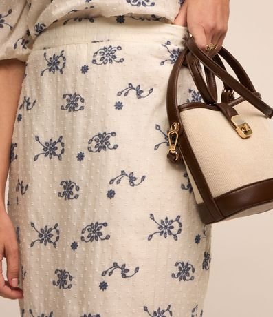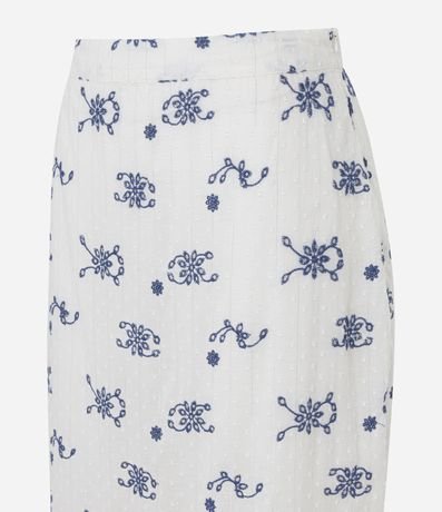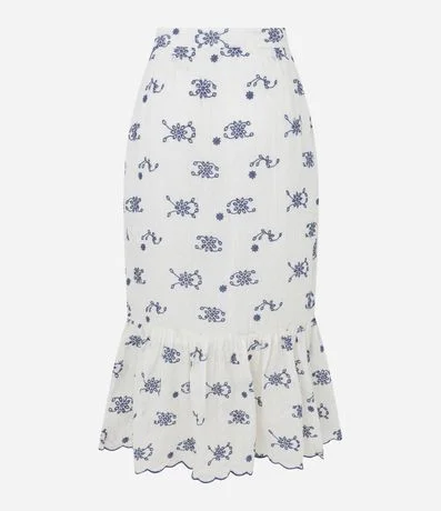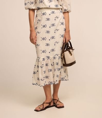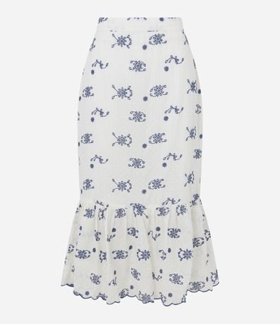 Ref: Saia midi sereia feminina, confeccionada em laise, com zíper na lateral, recorte na saia com babado e frufru. A peça também conta com estampa boho.