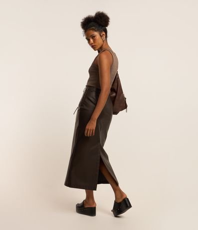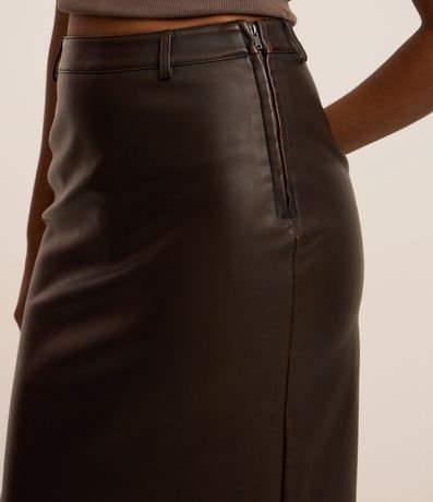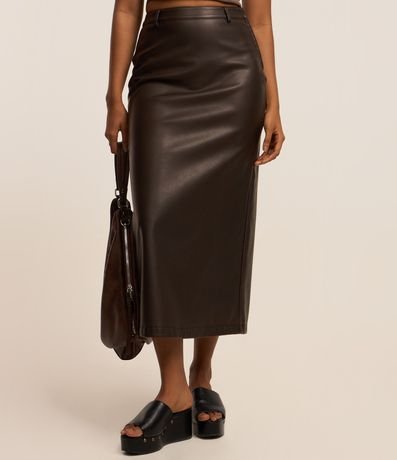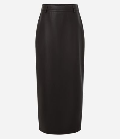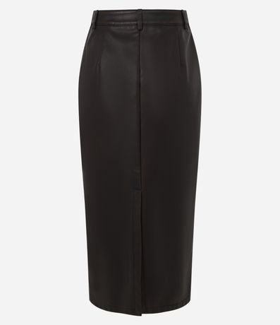 Ref: Saia midi confeccionada em material sintético, pu, com passantes no cós e fenda na parte de trás.
