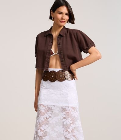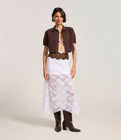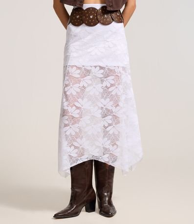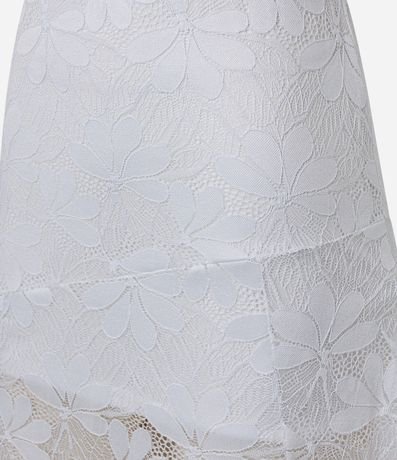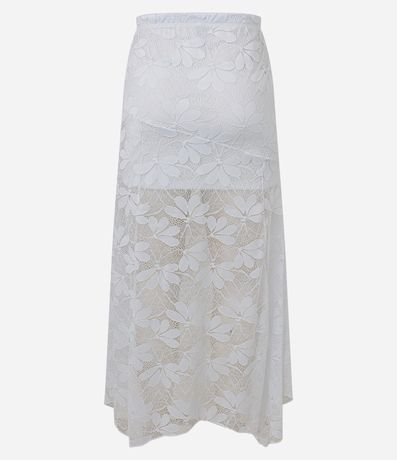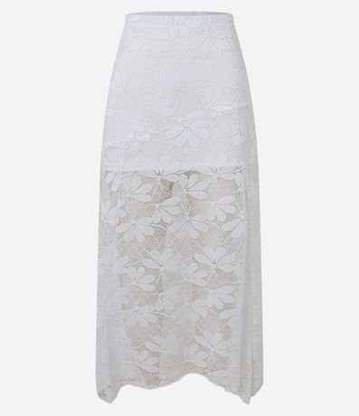 Ref: Saia feminina no modelo midi, com cós elástico, saia curta lisa com sobreposição de renda e barra assimétrica.
