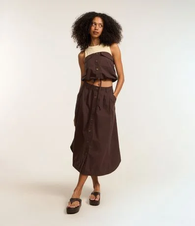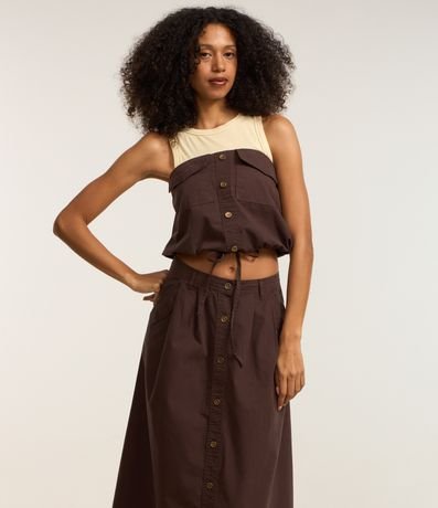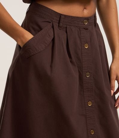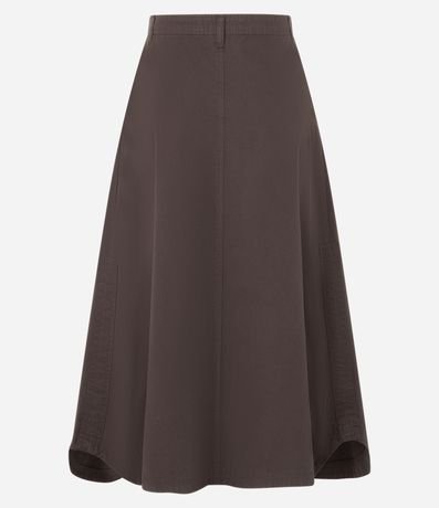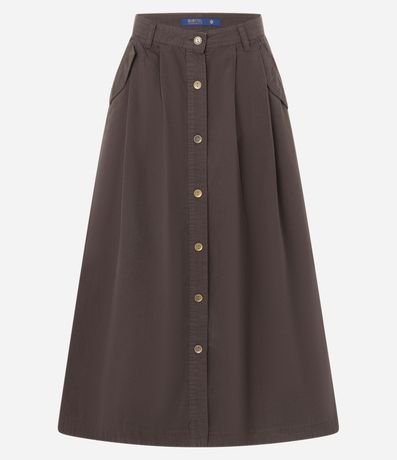 Ref: Saia feminina em sarja de algodão certificado bci confeccionado em melhores praticas ambientais, peça no modelo midi, com cós passante, abotoamento frontal, bolsos e fendas laterais.