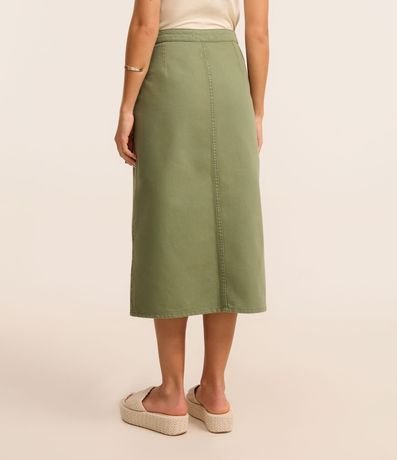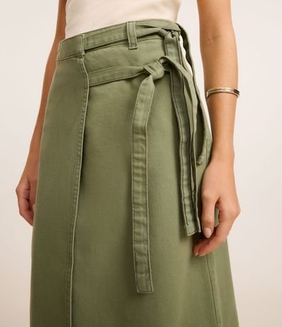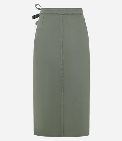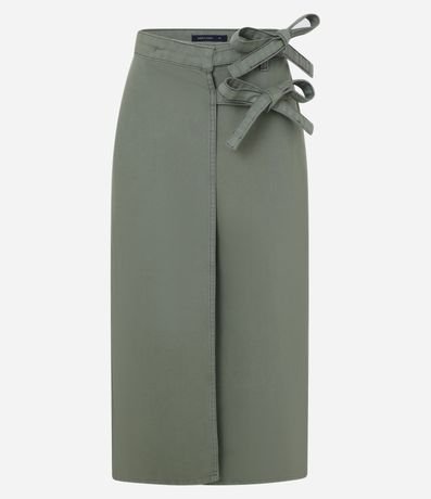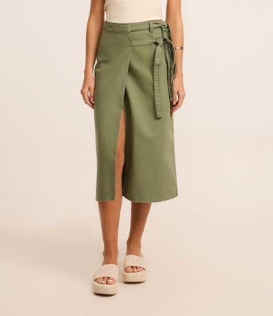 Ref: Saia feminina em sarja mais sustentável com boas praticas ambientais. Peça com cintura fixa, passantes, fenda profunda e cruzada, com fechamento lateral de duplo cinto de amarração.