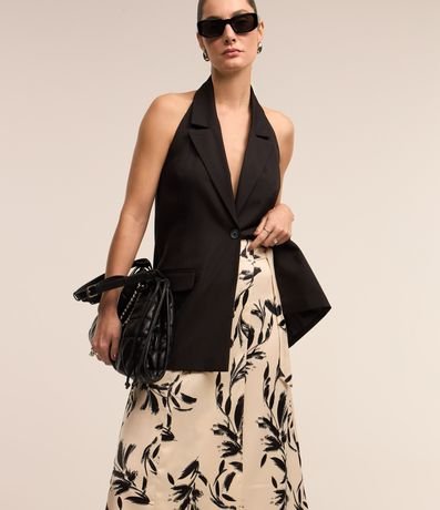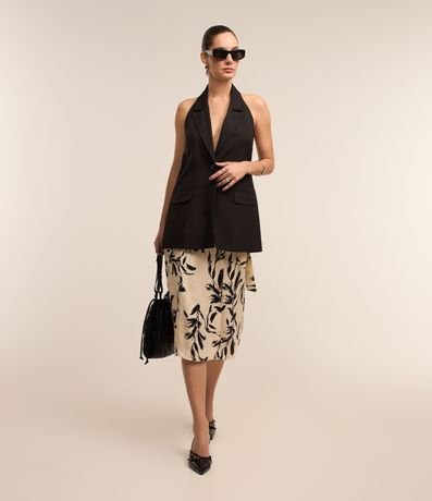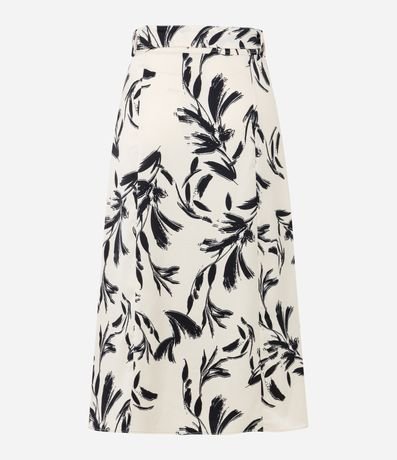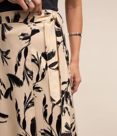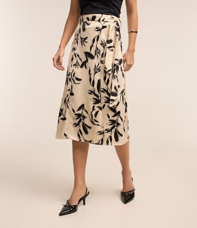 Ref: Saia midi feminina, confeccionada em tecido acetinado, com amarração lateral no cós e estampa folhagens.