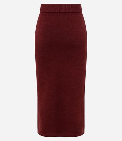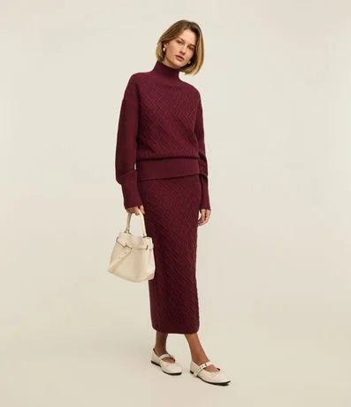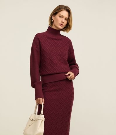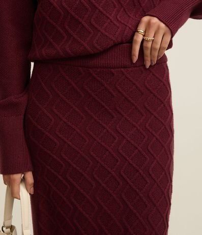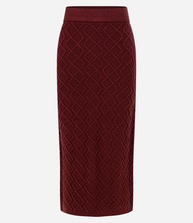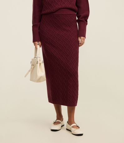Ref: Saia feminina midi cintura alta, confeccionada em tricôt, com cós elástico e bordado de losangos.