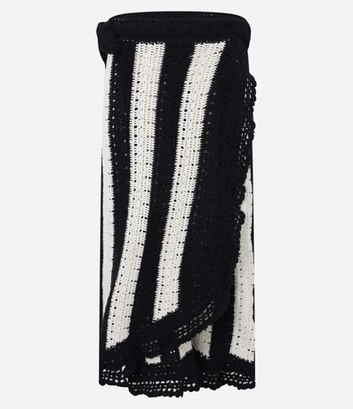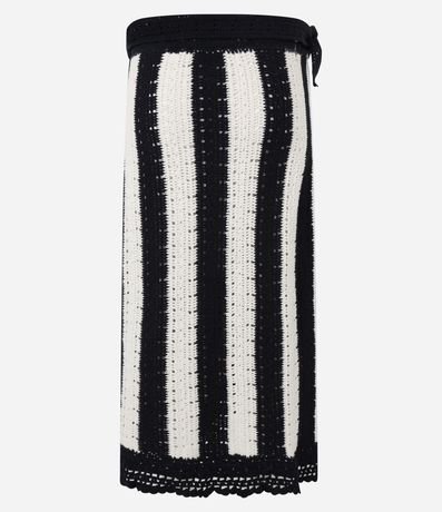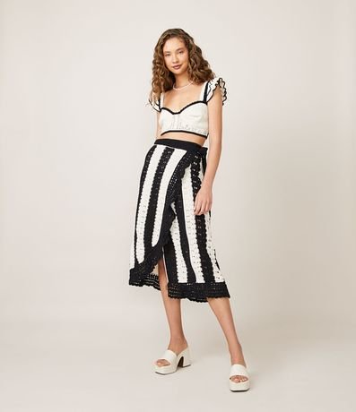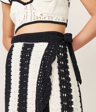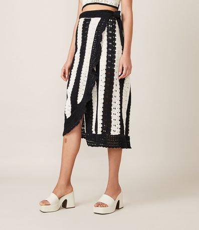 Saia midi em tricô com listras e amarração lateral na cintura. Seu diferencial fica por conta das listras verticais e dos detalhes em pontos crochetados.