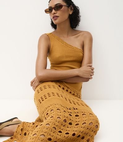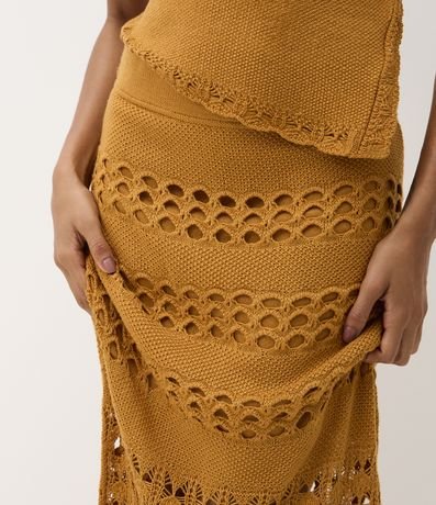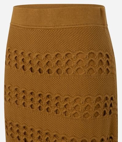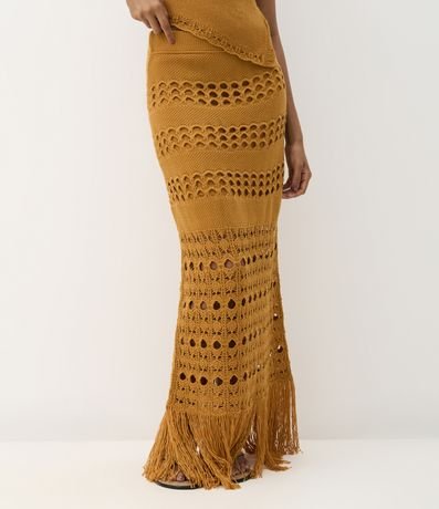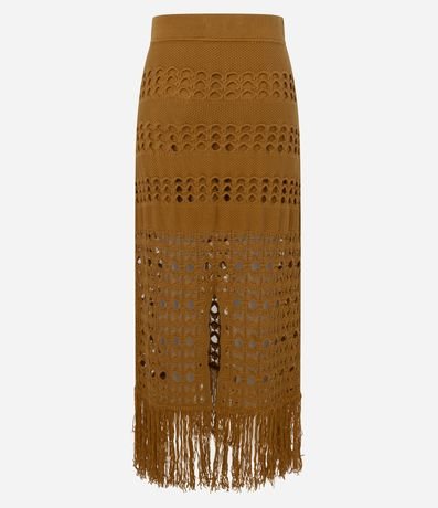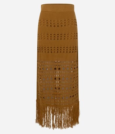 Ref: Saia midi, confeccionada em tricô, com elástico no cós, mix de pontos com pontos abertos/vazados e franjinhas na barra. Peça com forro.