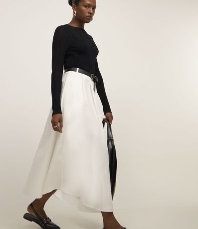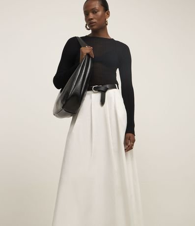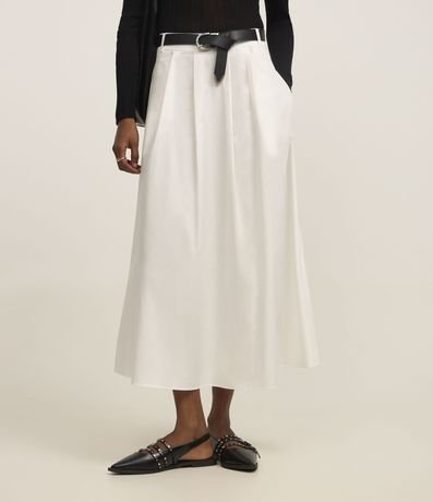 Ref: Saia de comprimento midi confeccionada em tricoline de algodão mais sustentável. A roupa possui fechamento com zíper nas costas, passantes na cintura além de pregas na parte frontal.