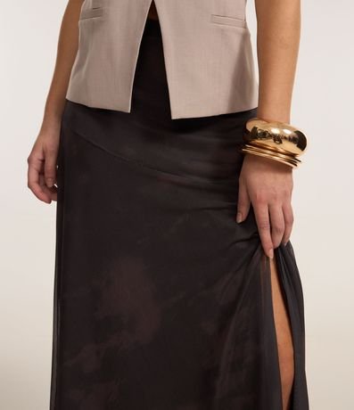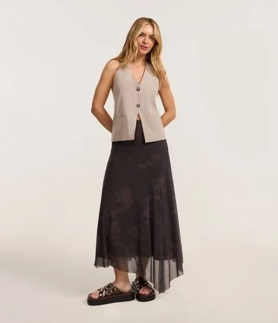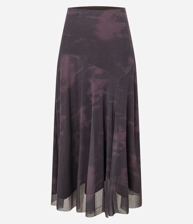 Ref: Saia feminina em tule confeccionada com tecido de pet reciclado, produto no modelo midi, com cós fixo, estampa manchadinha e barra assimétrica.