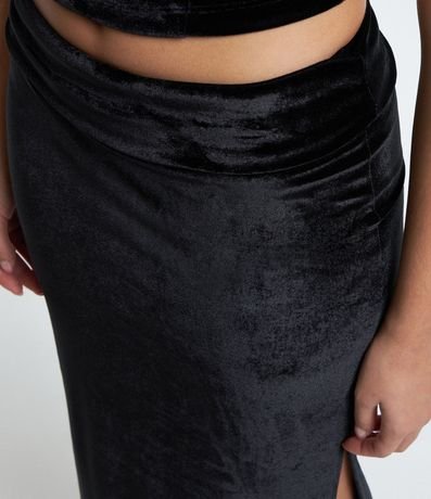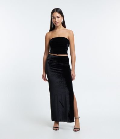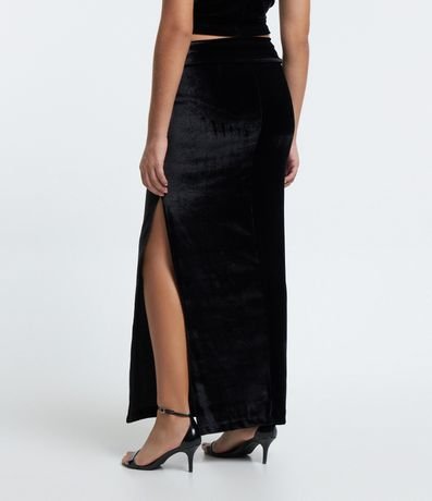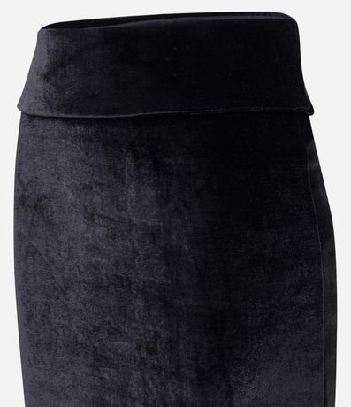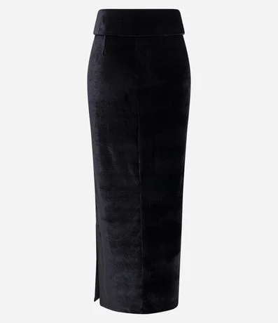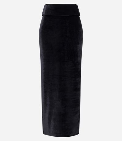 Saia midi, com detalhe dobradinho no cós e fenda na parte da frente.