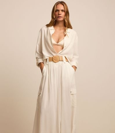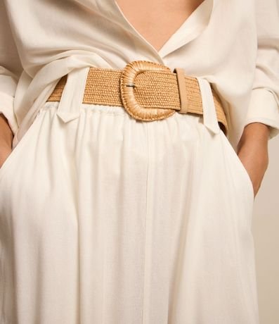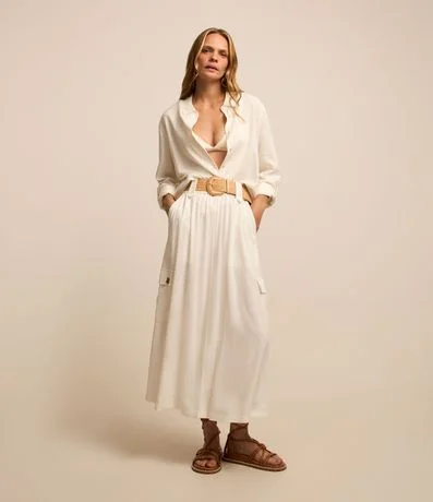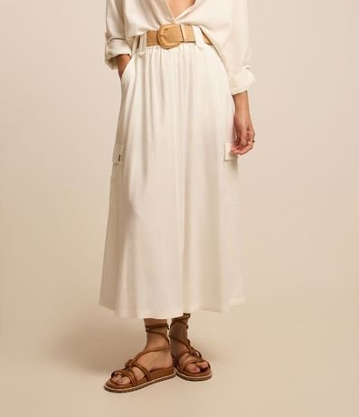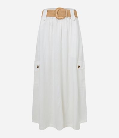 Ref: Saia feminina, confeccionada em material mais sustentável, no modelo midi, cós com passantes largos, cinto de ráfia e bolsos cargo. Peça ideal para um look mais despojado, clássico com um toque romântico.