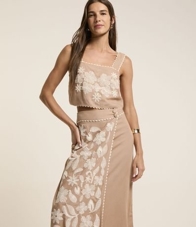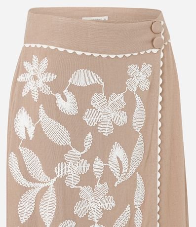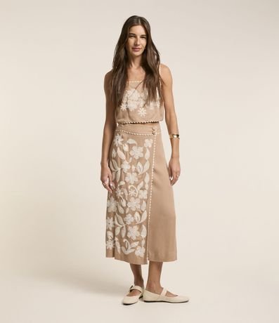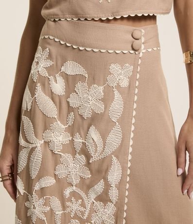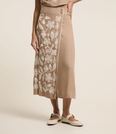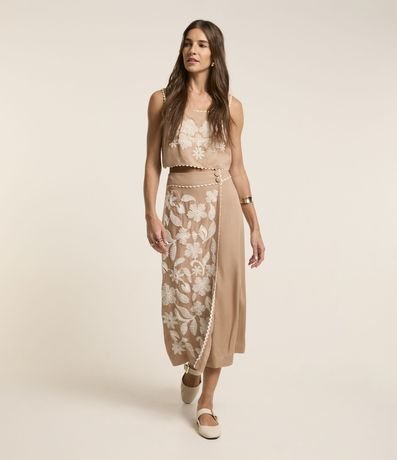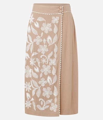 Ref: Saia midi feminina, confeccionada em viscolinho, com abotoamento no cós, estampa floral e borda nuvem.