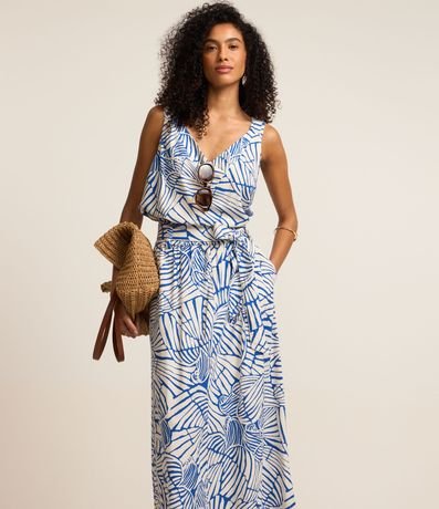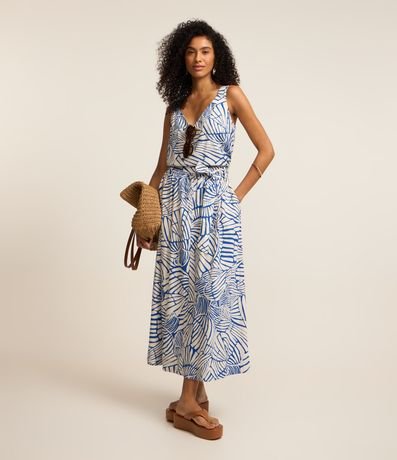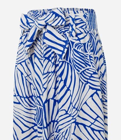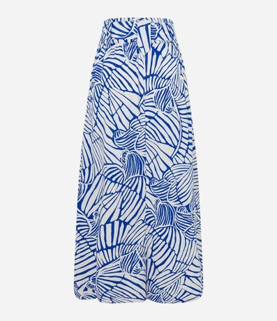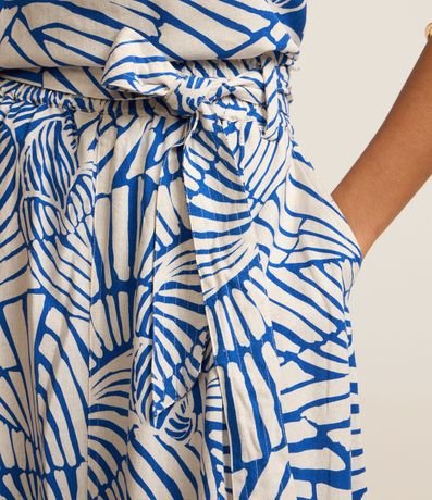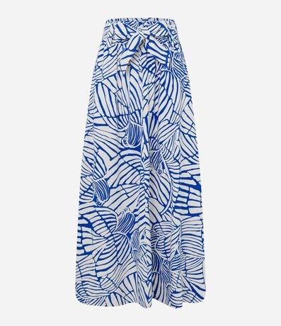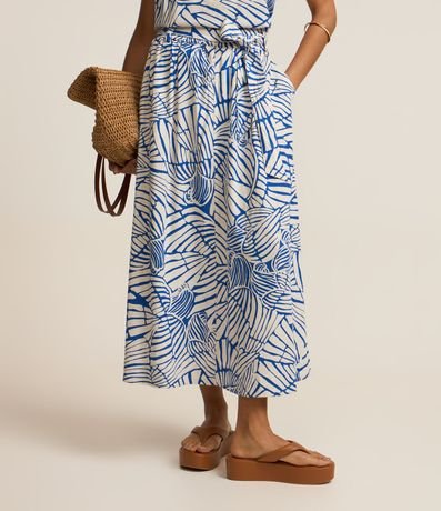 Ref: Saia midi de modelo evasê, confeccionada em viscose e linho, com faixa para amarração na cintura e estampa abstrata.