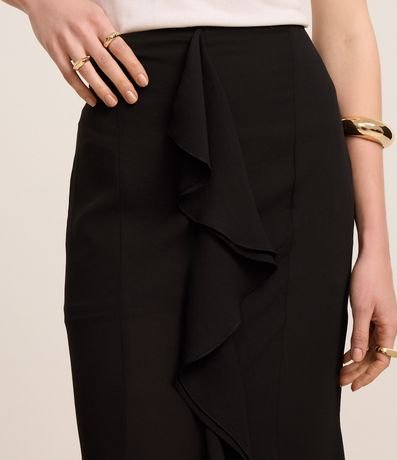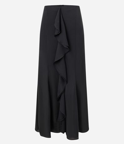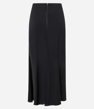 Saia feminina confeccionada em chiffon com cós fixo, no modelo long midi com detalhe de decido frontal e fechamento por zíper em vista oculta nas costas.