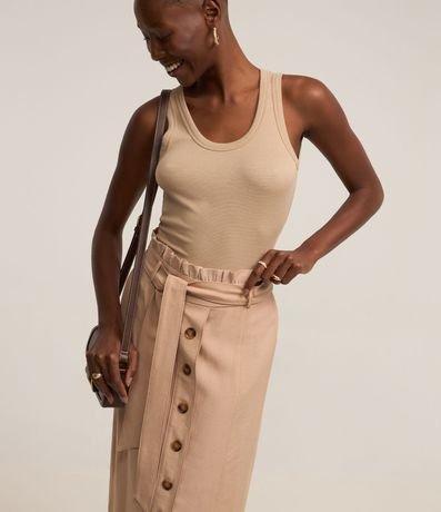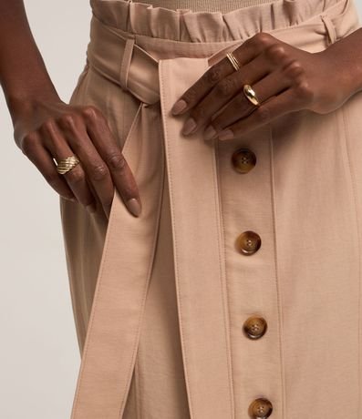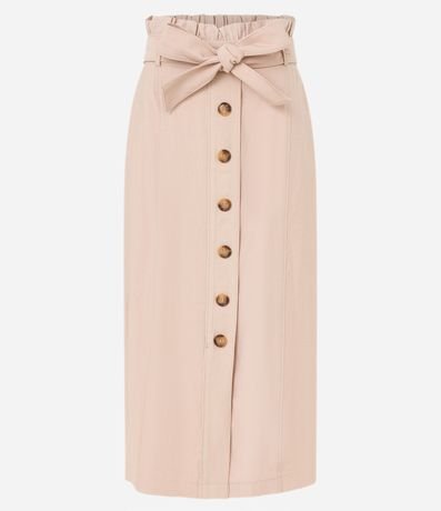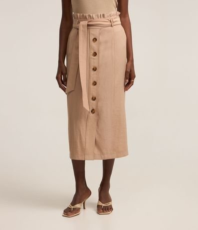 Ref: Saia reta, midi, em viscose com cós elástico, cinto faixa para amarração e abotoamento frontal.