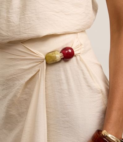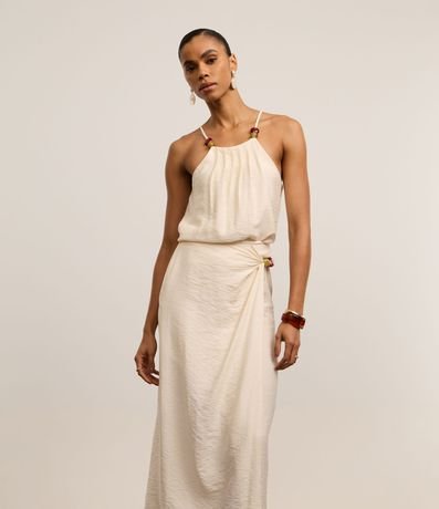 Saia feminina em crepe de viscose mais sustentável com boas práticas ambientais, midi no modelo reta com transpasse frontal e aviamento de bolotas coloridas na cintura lateral.