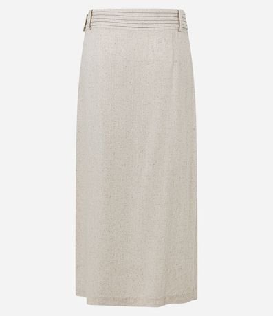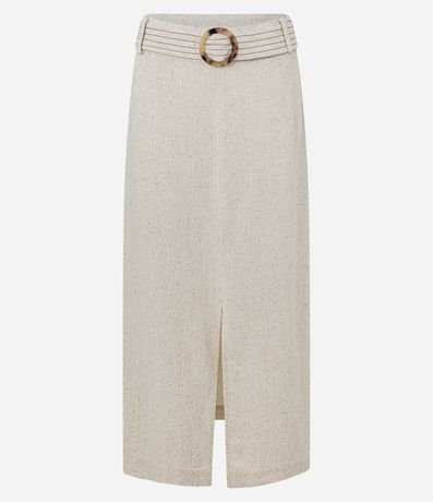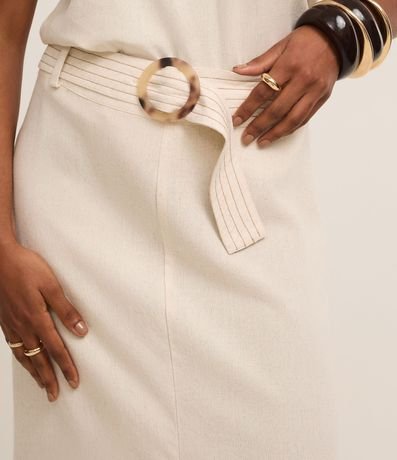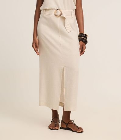 Ref: Saia feminina de modelo midi. Confeccionada em viscose e linho, possui corte reto, cinto com fivela e detalhamento de pespontos e fenda frontal