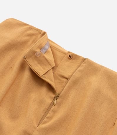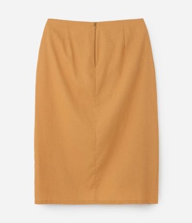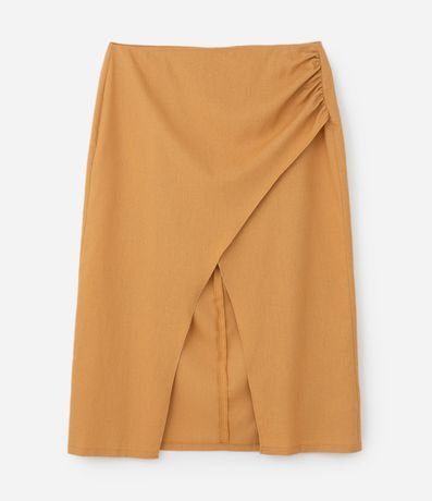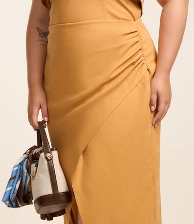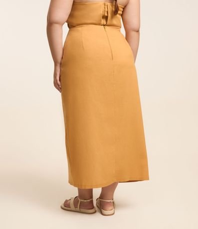 Ref: Saia midi plus size confeccionada em tecido com linho e viscose, sem estampa. A peça tem a frente transpassada com drapeado lateral, formando uma abertura frontal. O fechamento fica nas costas, com zíper e botão.