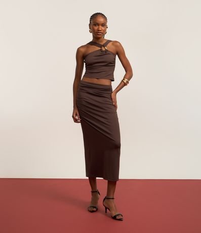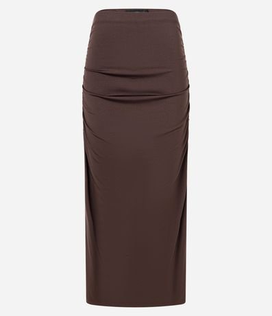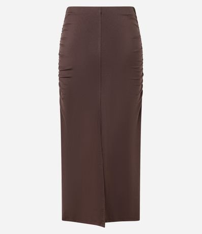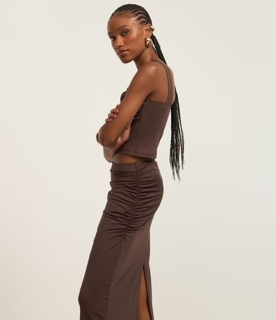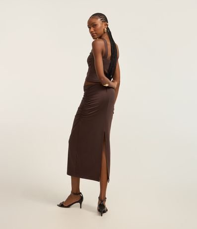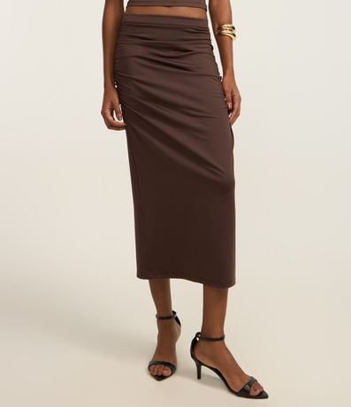 Saia new midi com cós elástico, franzidinhos nas laterais e fenda na parte de trás.