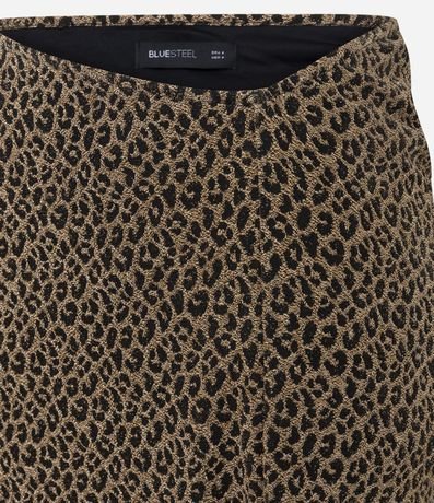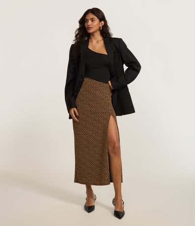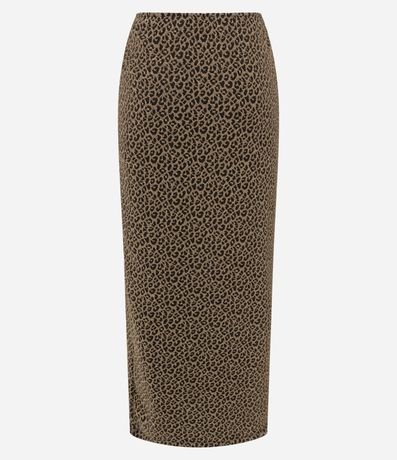 Saia alongada confeccionada em jaquard de oncinha com cós assimétrico e fenda na barra.