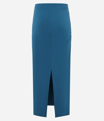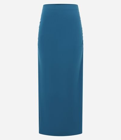 Saia new midi confeccionada em jersey e com franzido nas laterais.