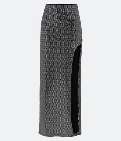Saia new midi, em meia malha com zíper lateral, metalizado e com barra arredondada.