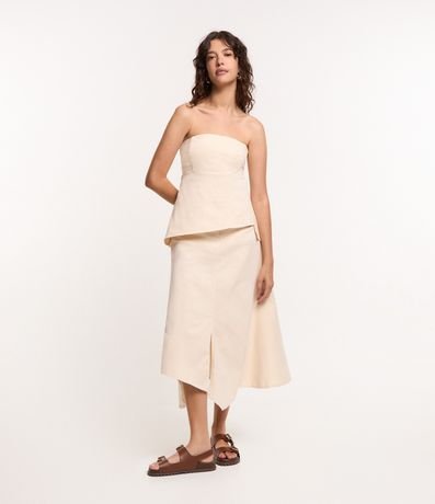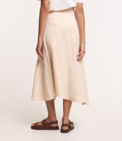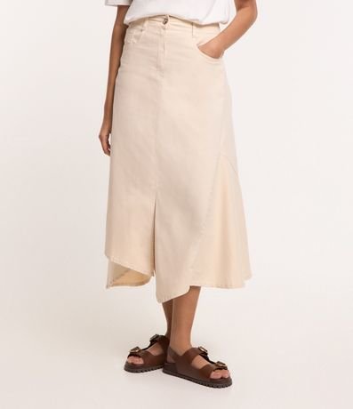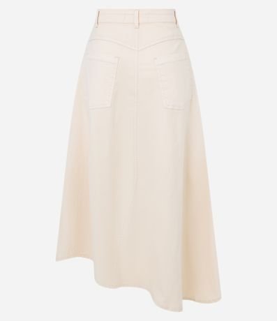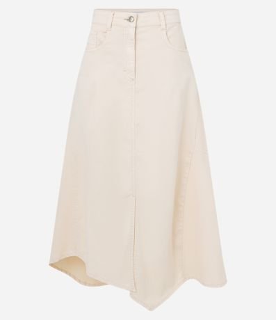 Ref: Saia new midi, em sarja leve, bolsos frente e costas, sem estampa com fenda frontal e barra assimétrica.