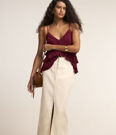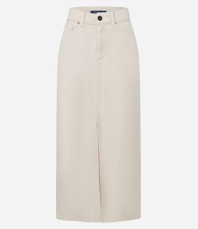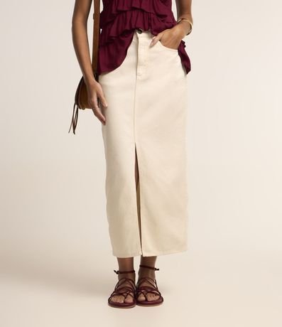 Ref: Saia new midi com passantes no cós, bolsos, confeccionada em sarja e com fenda na parte da frente.