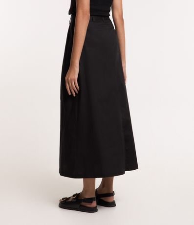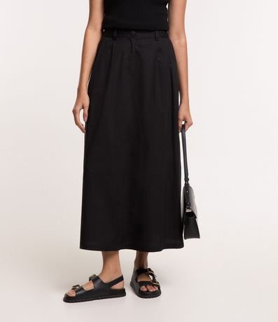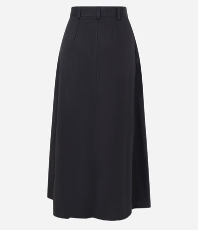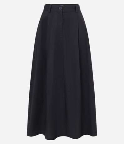 Ref: Saia new midi, em tricoline, cós largo com passantes, botão no fechamento e leves babados.