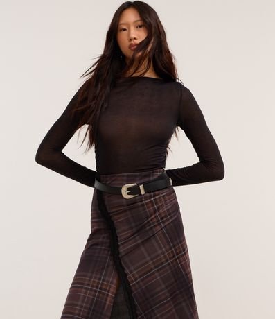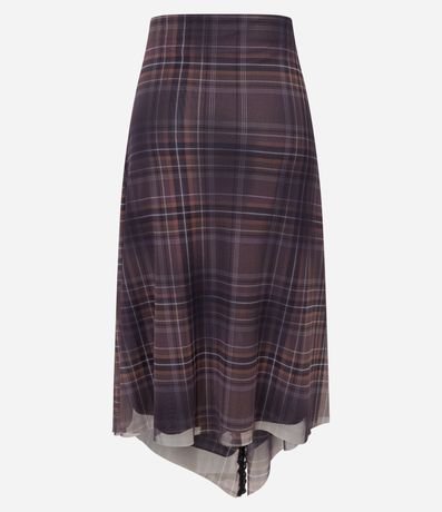 Ref: Saia new midi, xadrez com forrinho, confeccionada em tule, detalhe de rendinha na lateral, fenda e barra com pontas.